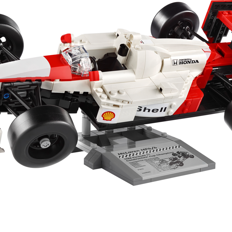 The McLaren MP4/4 replica features working steering, rod suspension, an adjustable rear wing, slick tyres, mirrors, a gear stick and a detailed turbocharged V6 engine, plus a display stand and information plaque with interesting statistics. The Ayrton Senna minifigure comes with a podium-style display stand and an information plaque with an iconic Ayrton Senna quote and photo.