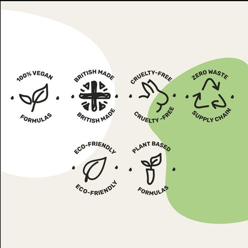 Free From: SLS/ SLES (Sulphates), Parabens, Phosphates, Phosphonates, Chlorine Bleaches, Sulphites, Isothiazolinones, Gluten, Microplastics, Artificial Preservatives and Colours, Triclosan, Petrochemicals, GMO's, E.D.T.A, Formaldehyde, Titanium Dioxide, Optical Brighteners, Lanoline, VOC's.