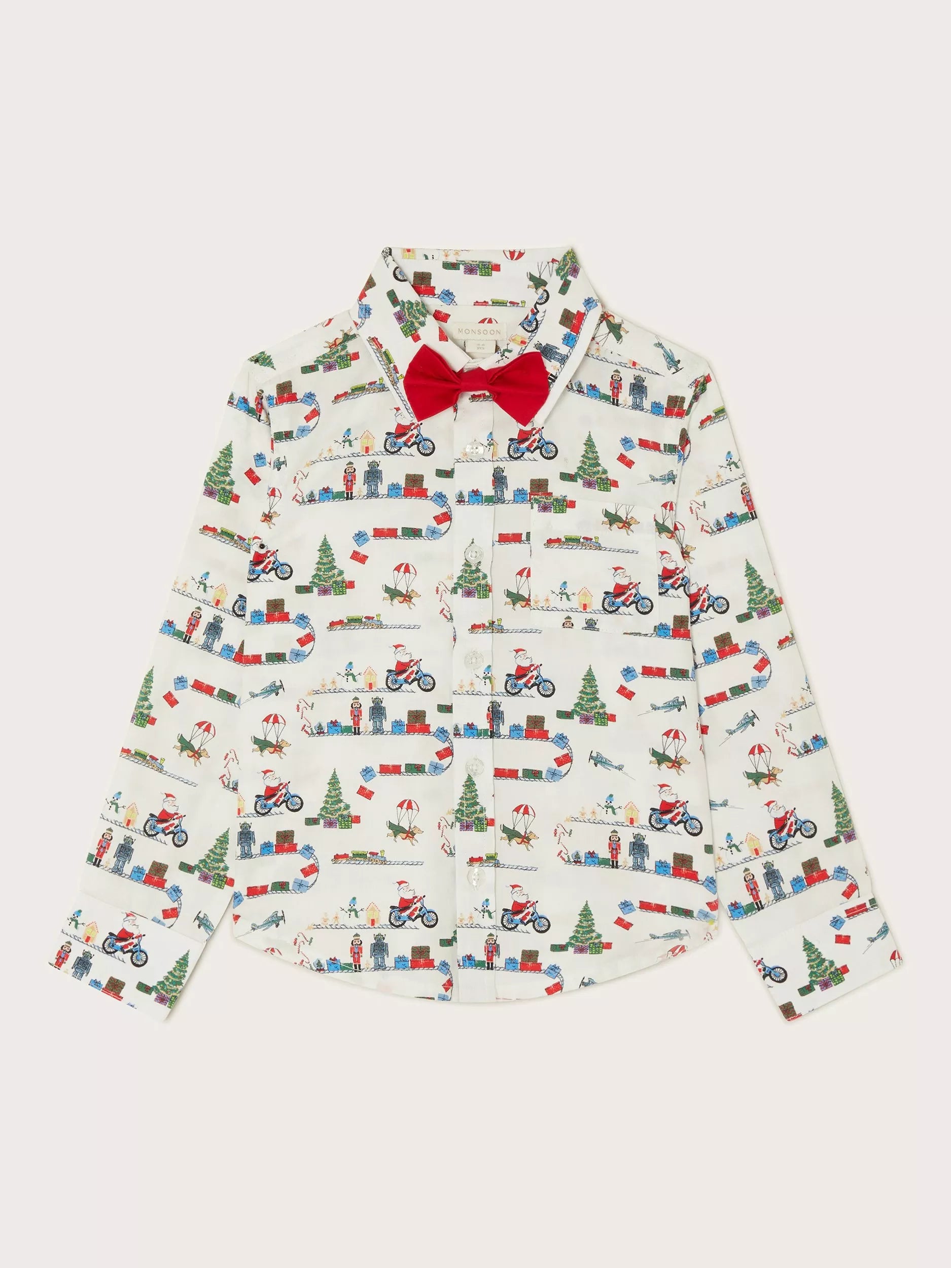 Their Christmas dinner outfit is sorted with this shirt in their wardrobe. Printed with a festive scene, this cotton shirt features button fastenings, classic shirt collar and a smart bow tie to finish.