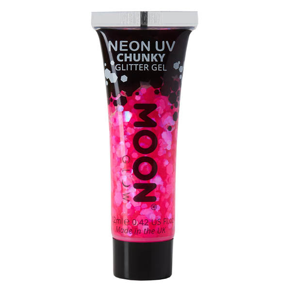 Create stunning, high-impact visual effects on the face and body using Moon Glow's Magenta Neon UV Chunky Glitter Gel. This vibrant formulation offers bright neon colour in standard light, which then fluoresces spectacularly under UV lighting for an incredible visual effect.