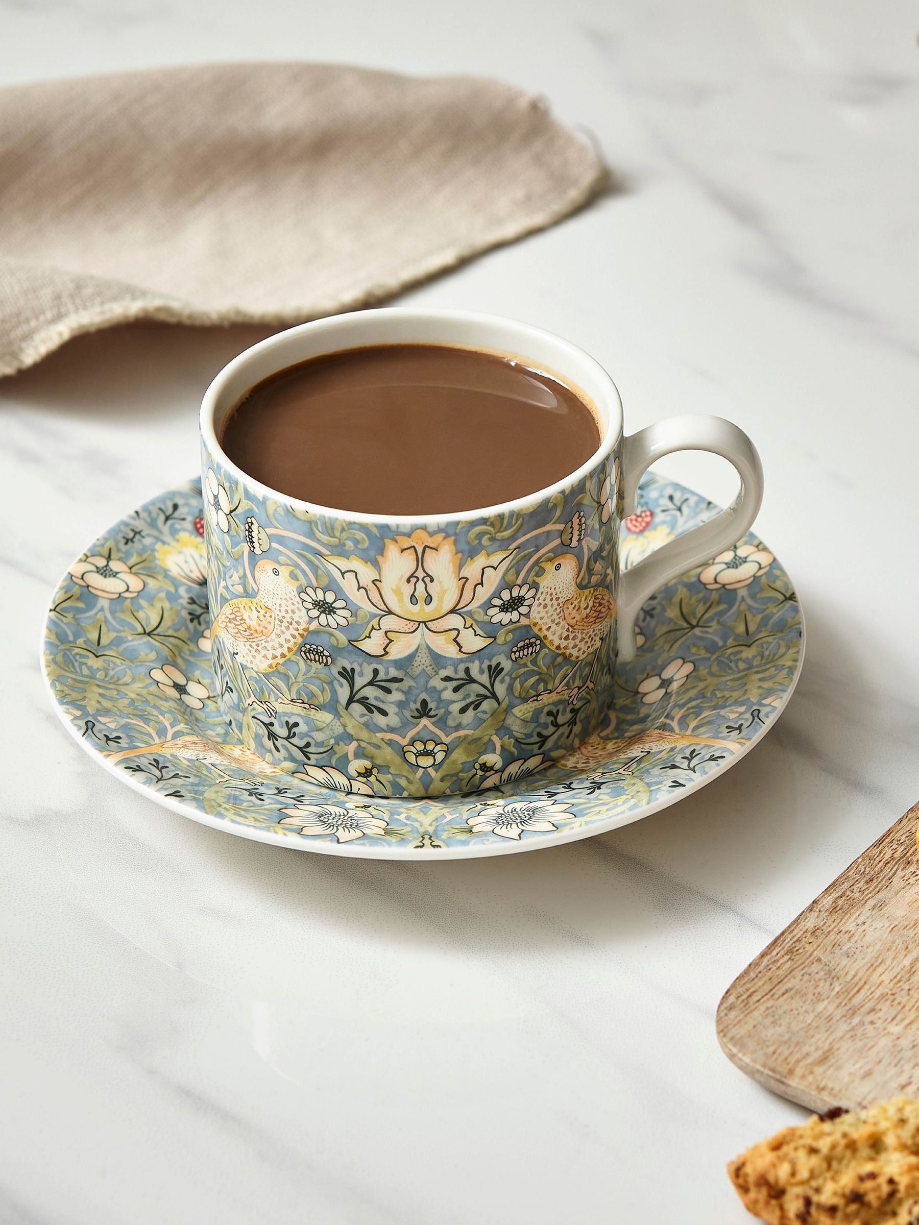 Celebrate 160 years of Morris & Co. with the Spode Morris & Co. Strawberry Thief teacup and saucer.Designed to be mixed and matched, whether you opt for one of each pattern, or treat yourself to an entire set of Strawberry Thief teacup and saucers - they re sure to elevate your afternoon tea to the next level. Product Specifications: Capacity: 12fl.oz / 340ml Dishwasher Safe: Yes. Microwave Safe: Yes. Freezer Safe: Yes. Oven Safe: Up to 220C. Material: Porcelain.