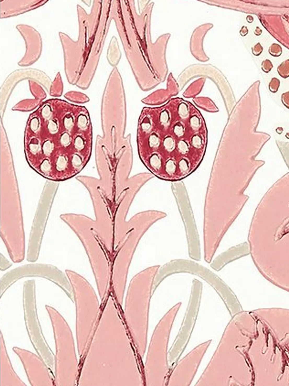 A cheeky bird pecks at delicious strawberries on this iconic Morris & Co. design, repainted and engraved here for the first time to enable surface printing. This new interpretation of "Strawberry Thief" displays an authentic hand-block printed look.