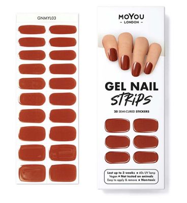 Elevate your manicure game with MoYou London's Cinnamon Bun Semi-cured Gel Nail Strips. These offer stunning designs and achieve salon-quality results conveniently from the comfort of home. They provide an advanced alternative to traditional nail wraps for a refined look.