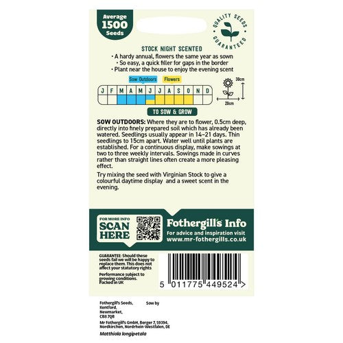 This packet from Mr Fothergills contains 1500 seeds of hardy annual stock that flowers within the same year it is sown. Sow these directly into finely prepared soil, planting them 0.5cm deep after watering the area first. For a continuous colourful display, consider making sequential sowings every two to three weeks for these lovely scented flower seeds. You can also mix these with Virginian Stock to enhance evening fragrance.