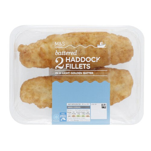 Read MoreM&S 2 Battered Haddock Fillets Two haddock fillets in a light golden batter. Simply oven cook and serve alongside chunky chips and mushy peas. Serves 2. Our M&S seafood products have been sourced from fisheries and fish farms in a way that minimises their ethical and environment impact, while guaranteeing you the highest quality, delicious seafood you’d expect from M&S.