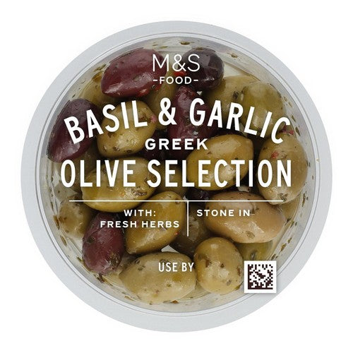 Read MoreM&S Basil & Garlic Marinated Olive Selection A selection of basil and garlic marinated stone-in olives, including mild Halkidiki olives, tangy Amfissa olives and full-bodied Kalamata olives. Suitable for vegans.