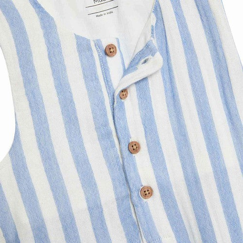 This two-piece baby summer outfit is crafted from pure cotton, offering a comfortable and charming choice for warmer days. The set includes a sleeveless romper and a matching sunhat, both decorated with a sweet striped print. This ensemble provides an easy, coordinated option for your child's daytime wear.