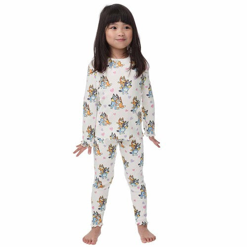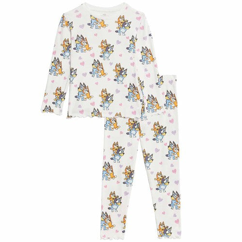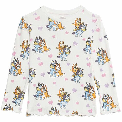 Read MoreBluey™ fans will love snuggling down in these cotton-rich long-sleeved pyjamas. Made in a regular fit from a slightly stretchy fabric. All-over print featuring the loveable puppy and her little sister, Bingo, and dotted with pink and purple hearts.