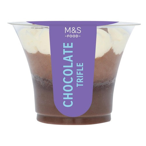 This M&S Chocolate Trifle delivers a decadent dessert experience in every serving. It is constructed in distinct layers, offering a variety of textures and rich chocolate flavour profiles throughout. This item is also suitable for vegetarian diets.