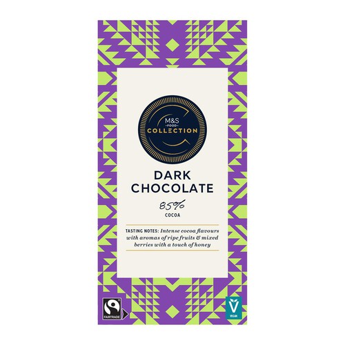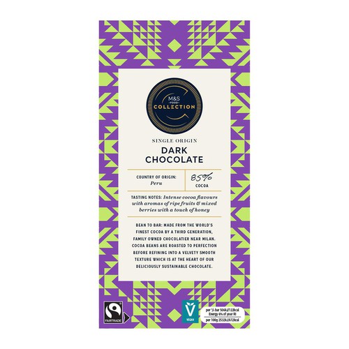 Experience the rich intensity of MS Collection 85 Peruvian dark chocolate. This bar features deep cocoa flavours balanced by fruity and sweet undertones. It is crafted by a third-generation, family-owned chocolatier located near Milan.