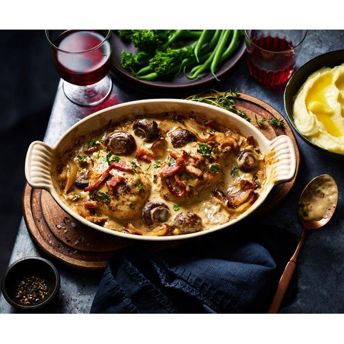 Buttermilk marinated British chicken breast, baby chestnut mushrooms, red onions & outdoor bred bacon, served in a creamy white wine sauce