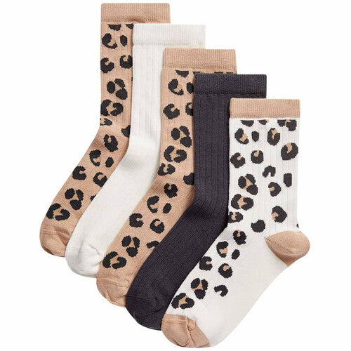 This pack of five cotton-rich ankle socks is a fun choice for their essentials. Stretchy ribbed styles. Set includes a mix of playful leopard designs and plain pairs.