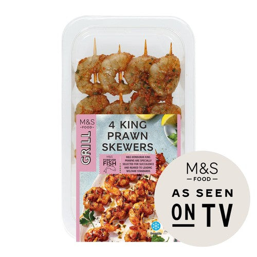 • Four king prawn skewers included in the pack.