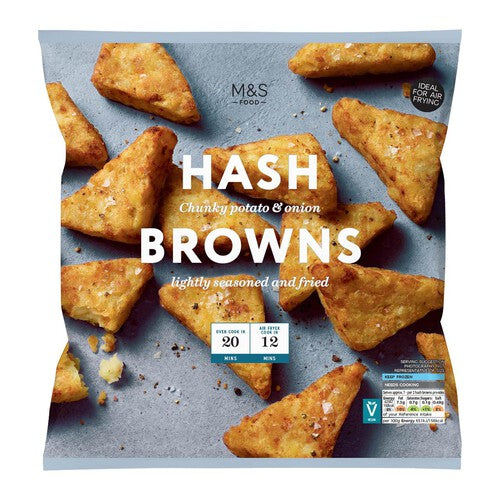 Read MoreM&S Hash Browns Frozen Chunky potato and onion hash browns, lightly seasoned and fried. Oven cooks straight from frozen in 20 minutes. Or cook in the air fryer for 12 minutes. Suitable for vegans.