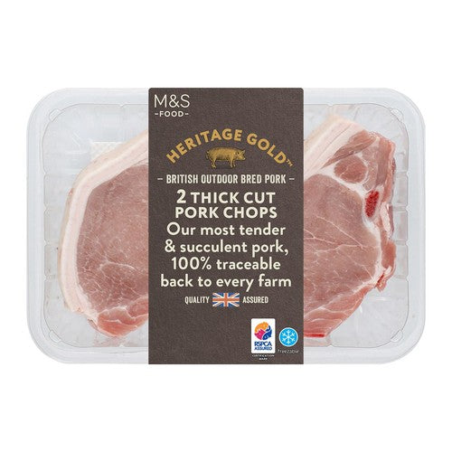 These M&S Heritage Gold pork chops feature thick-cut meat sourced from British outdoor-bred pigs. They are designed to deliver exceptional tenderness and succulence for your main meals. This pack contains two substantial chops ready for preparation.