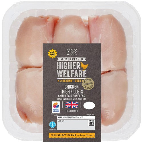 M&S Oakham Gold Chicken Thigh Fillets are sourced from flocks naturally slower reared under leading welfare standards. This range sets high benchmarks for quality and care in poultry production.