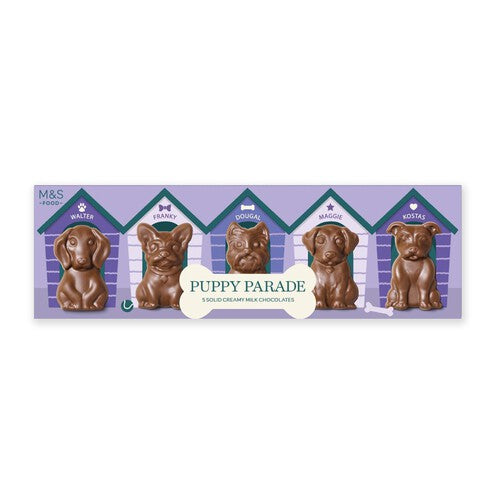 Enjoy this playful collection of M&S Puppy Parade Chocolates, featuring five individually crafted solid milk chocolate figures. Each piece is shaped like a distinct puppy, offering a fun and charming selection for any occasion. These creamy chocolates provide a sweet treat suitable for dog lovers.