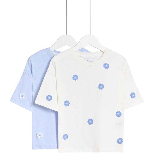 Refresh their wardrobe with these pretty pure cotton tops. Comfy regular fit. Pack of two includes different colours with embroidered applique flowers.