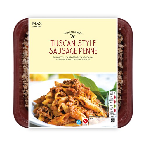 This ready-to-heat M&S Tuscan Style Sausage Penne offers a simple Italian-inspired dish for two people. It features Italian-style sausagemeat combined with penne pasta, all coated in a mildly spicy tomato sauce.