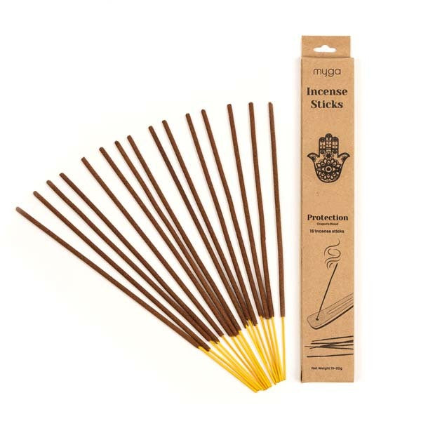 Myga offers Dragon's Blood Protection in these carefully crafted incense sticks. Each individual stick is hand-rolled onto a bamboo core using unique natural extracts and herbs for a distinct scent profile. These natural room fragrance options are ideal for creating atmosphere during yoga or meditation practices.