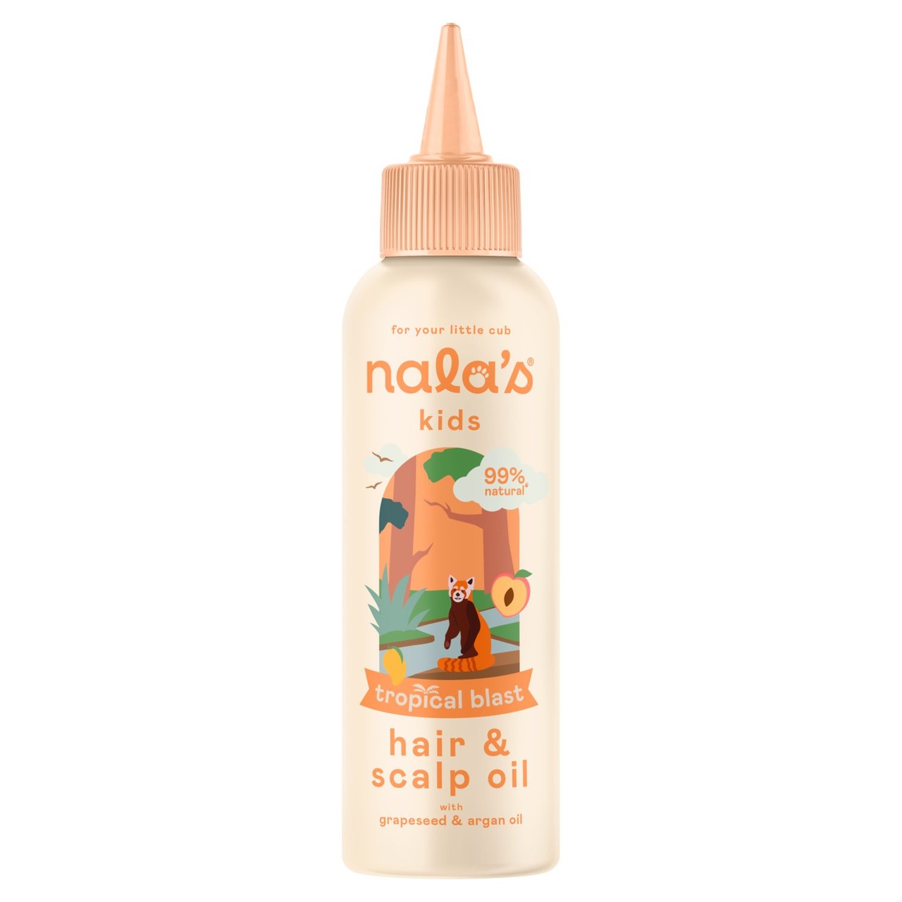 Nala's Kids Hair Oil features a formulation derived from 99% natural ingredients to promote hair health. This tropical blend offers essential hydration for both the hair shaft and the scalp area. It is formulated to be suitable for all hair types requiring moisture.