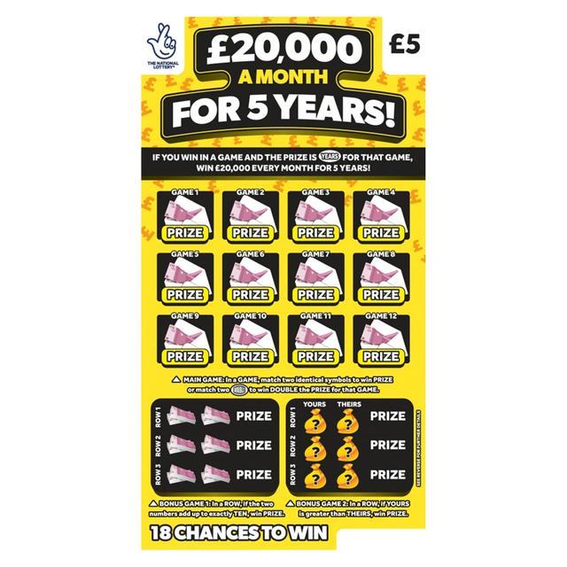 Product details Description Regular Payment Game Chances to win:18 Top Prizes Of: £1,200,000 Odds: 1 in 3.28 "£5 £20,000 A Month For 5 Years Scratchcard from The National Lottery with the chance to win a top prize of £1,200,000 in an instant. Are you looking for a little treat for... Read More