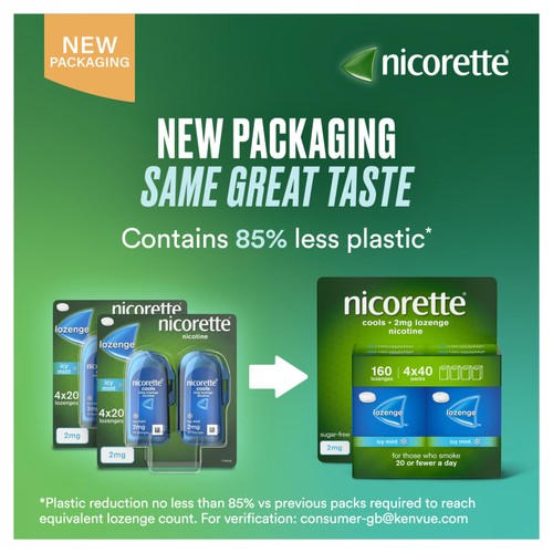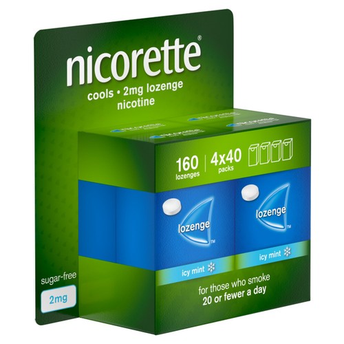 Read MoreReady to quit smoking? Help control cravings in a fast and easy way with Nicorette Cools 2mg nicotine lozenges, clinically proven to start relieving cravings in just 2 minutes. Nicorette Lozenges are an easy and discreet stop smoking aid that can fit into your pocket, purse, bag or backpack and you'll be ready whenever cravings strike. Nicorette lozenges use their fast flavour technology to provide a refreshing Icy Mint taste. This is delivered by a rapid burst of flavour from the outer coating and additional flavour released from the inner core. Nicorette Lozenges are available in 2mg and 4mg strengths. Choose 2mg nicotine lozenges if you smoke 20 cigarettes or fewer a day or 4mg nicotine lozenges if you smoke more than 20 cigarettes a day. Nicorette 2mg nicotine lozenges are now available in convenient larger quantity packs of 40, 80 and 160 pieces. Choose Nicorette Lozenges to help you on your quit smoking journey. Nicorette Cools 2mg Lozenge contains nicotine. Stop smoking Aid. Requires willpower. Always read the label.