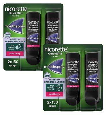 This bundle provides two full packs of Nicorette QuickMist Cool Berry 1mg/spray mouthspray, designed to support approximately 8 weeks of use. This formulation is used to actively relieve withdrawal symptoms and significantly reduce the intense cravings associated with stopping tobacco or e-cigarette use. It serves as a generally recognized safer alternative when compared to continuing to smoke.