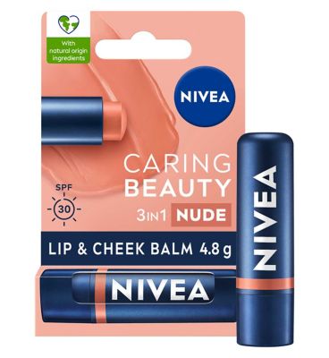 Read MoreNIVEA 3in1 Caring Beauty Lip & Cheek Balm Nude for LIPS & CHEEKS! Our buttery 3in1 formula for lips and cheeks delivers a RICH colour without drying out, provides 24 h moisture and helps to protect against collagen loss thanks to sun protection with SPF 30*. Pro Tip: CARING BEAUTY shades are layerable – combine them to create additional unique shades!