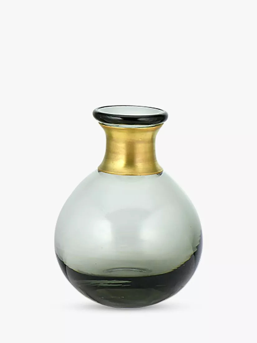 The Nkuku Miza collection of coloured vases are perfectly proportioned with an appealing curved contour and soft tones that pair beautifully with the decorative brass ring. Mix and match the sizes to create an eye-catching display.