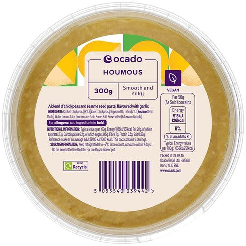 Read MoreOcado Houmous. A blend of chickpeas and sesame seed paste, flavoured with garlic. Houmous is a Middle Eastern and Mediterranean dip that has become incredibly popular worldwide. With a creamy and smooth texture, it has a well-balanced flavour with an earthy, nutty base from the chickpeas. Sesame seeds contribute a unique savoury depth and the garlic adds a pungent kick. Suitable for vegans. Houmous is incredibly versatile and is a staple Middle Eastern and Mediterranean cuisine where it's often served as part of a mezze platter with pita bread, vegetables, and other dips. It perfectly pairs with falafel and shawarma, grilled chicken, lamb, or fish and as part of a fresh, vibrant salad bowl. Our Ocado houmous is available in two pack sizes: S - 200g L - 300g From cold cuts to creamy dips, spicy meats and tangy olives, we’ve got everything you need for your antipasti platter, simply search for ‘Ocado deli’. Did you know? We've made a packaging change and removed our cardboard sleeve, saving up to 7 tonnes of paper per year across our Ocado Own Range dips. Once your dip has been eaten and enjoyed, you can rinse and recycle it all.