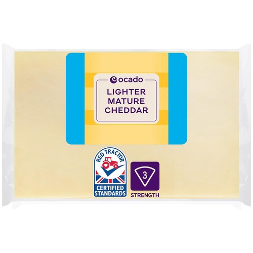 This Ocado Lighter Mature Cheese delivers the expected robust flavour of a mature cheddar while offering a reduced-fat alternative. Made using pasteurised milk, this Red Tractor-certified cheese is produced at an award-winning creamery. It maintains a smooth texture and a deliciously tangy finish, suitable for everyday enjoyment.