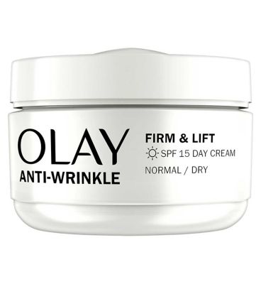 Read MoreOlay Anti-Wrinkle Firm & Lift Day Cream helps to visibly reduce fine lines and wrinkles, while protecting against premature signs of aging with SPF15 to combat UVA + UVB rays. It provides you with all-day moisture to help boost skin firmness, for skin that appears renewed and re-energised with improved elasticity, for noticeable results week by week. Designed with SKIN RENEWAL COMPLEX, including Vitamin B3, it activates surface cell renewal to improve skin's smoothness. The formula is fast absorbing and non-greasy, for a delightful feel on skin.