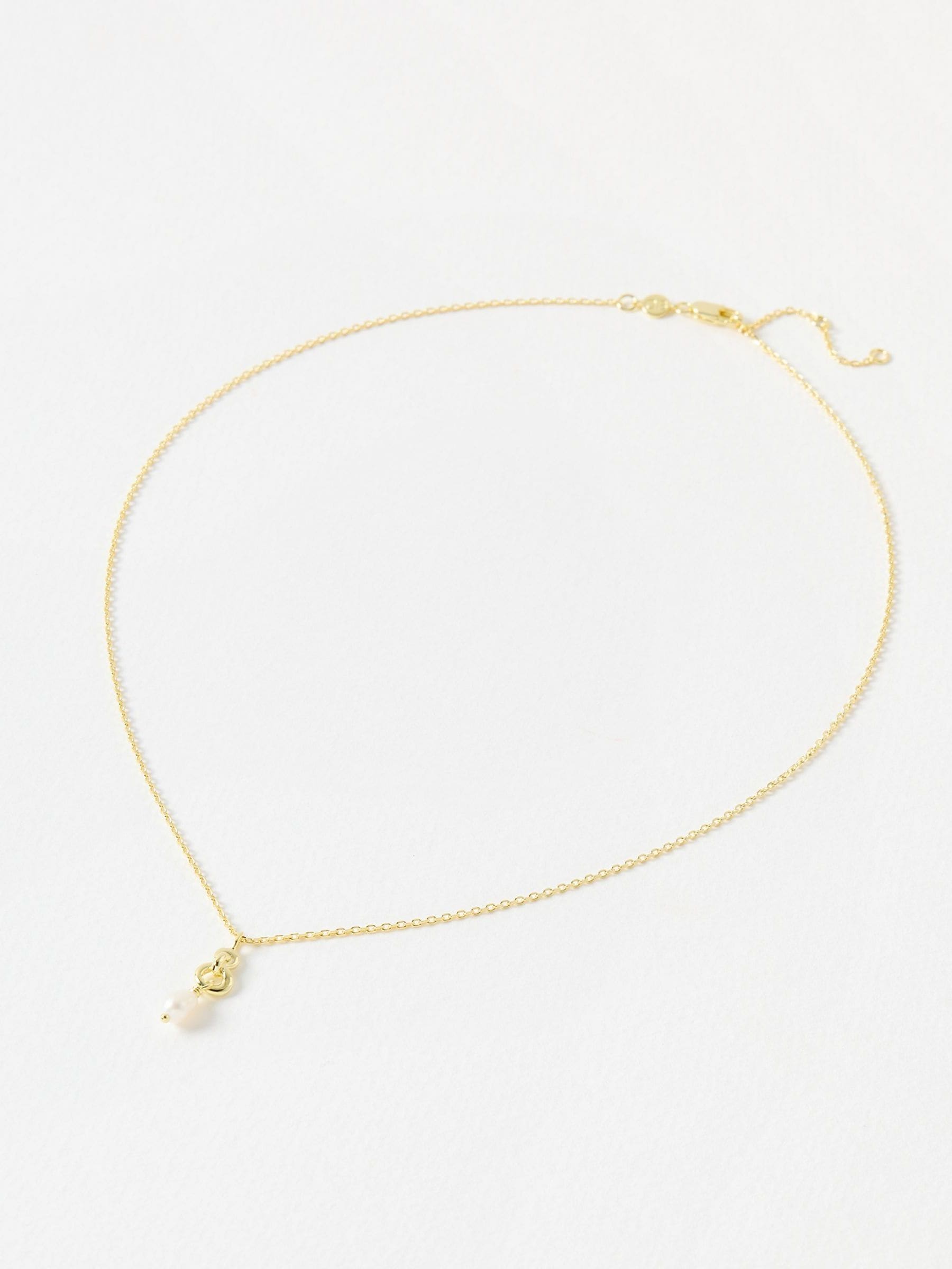 Gold-plated pendant necklace with double loop charm and freshwater pearl drop for an elegant finish. With a polished, shiny surface, style with the matching Rita Pearl Drop Earrings for cohesive, smart styling and wedding-ready looks.