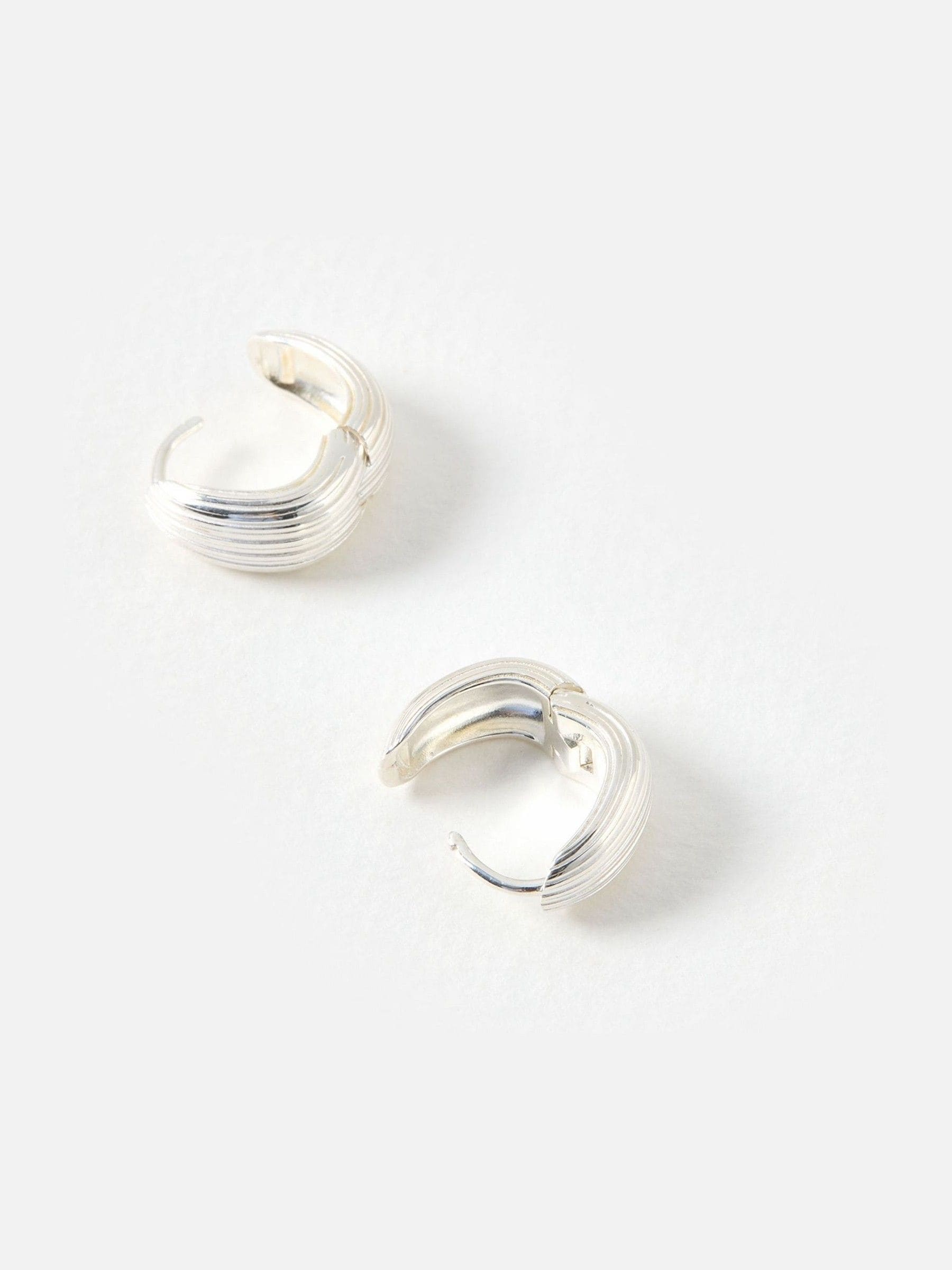 Chunky sterling silver hoop earrings with a textured surface and a clicker closure. Style these chunky hoop earrings with a silver necklace and bracelet for a stylish, wedding guest-ready look, or to complement smart occasion wear.