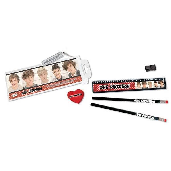 This officially licensed One Direction stationery set equips students with five essential writing and drawing tools. The collection features a consistent logo and printed design across all components, confirming its authentic branding. It is perfect for school requirements or collecting due to its guaranteed official status.