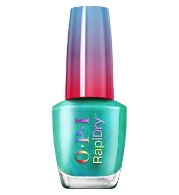 This OPI polish showcases the Speed Of Bright shade, presenting a shimmering green hue that transitions beautifully to blue. Experience high-speed results with the RapiDry™ system designed to eliminate common manicure frustrations. This quick-dry lacquer ensures a smooth, worry-free finish soon after application.