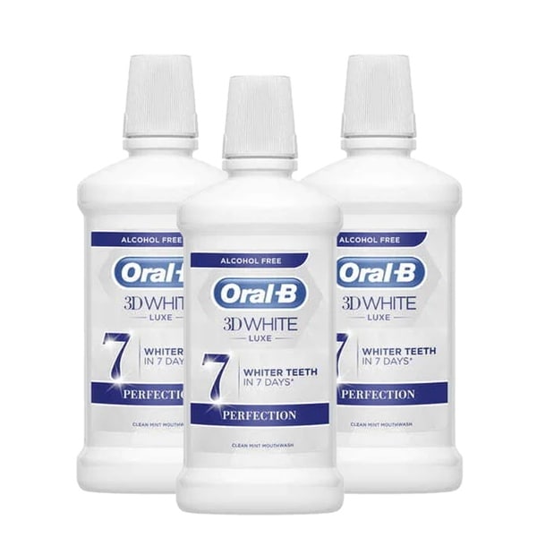 oralb 3d white luxe perfection mouthwash bundle 500ml x3 online only bundle triple pack oralb 3d white luxe perfection mouthwash provides whiter teeth in 7 days with brushing by removing surface stains and leaves your mouth fresh without alcohol burn