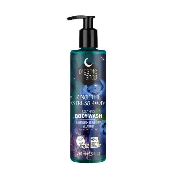 - Relaxing Body Wash, 280 ml Rinse the stress away! The soothing scent of lavender, skin nourishing blueberry, and melatonin work together to revive your skin and create a relaxing atmosphere for a deeply restful sleep. Certified Vegan by The Vegan Society. Part of the Organic Shop Dreamy Nights Body Care Collection, made with Lavender, Blueberry and Melatonin to create the ultimate recipe for relaxation and well
