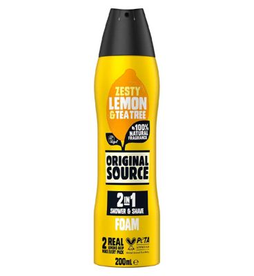 Original Source Lemon and Tea Tree Foam provides a versatile cleansing experience suitable for showering and shaving. This unique product features a zesty fragrance derived from 100% natural notes. It begins as a refreshing shower gel that transforms into ample, creamy foam when used.