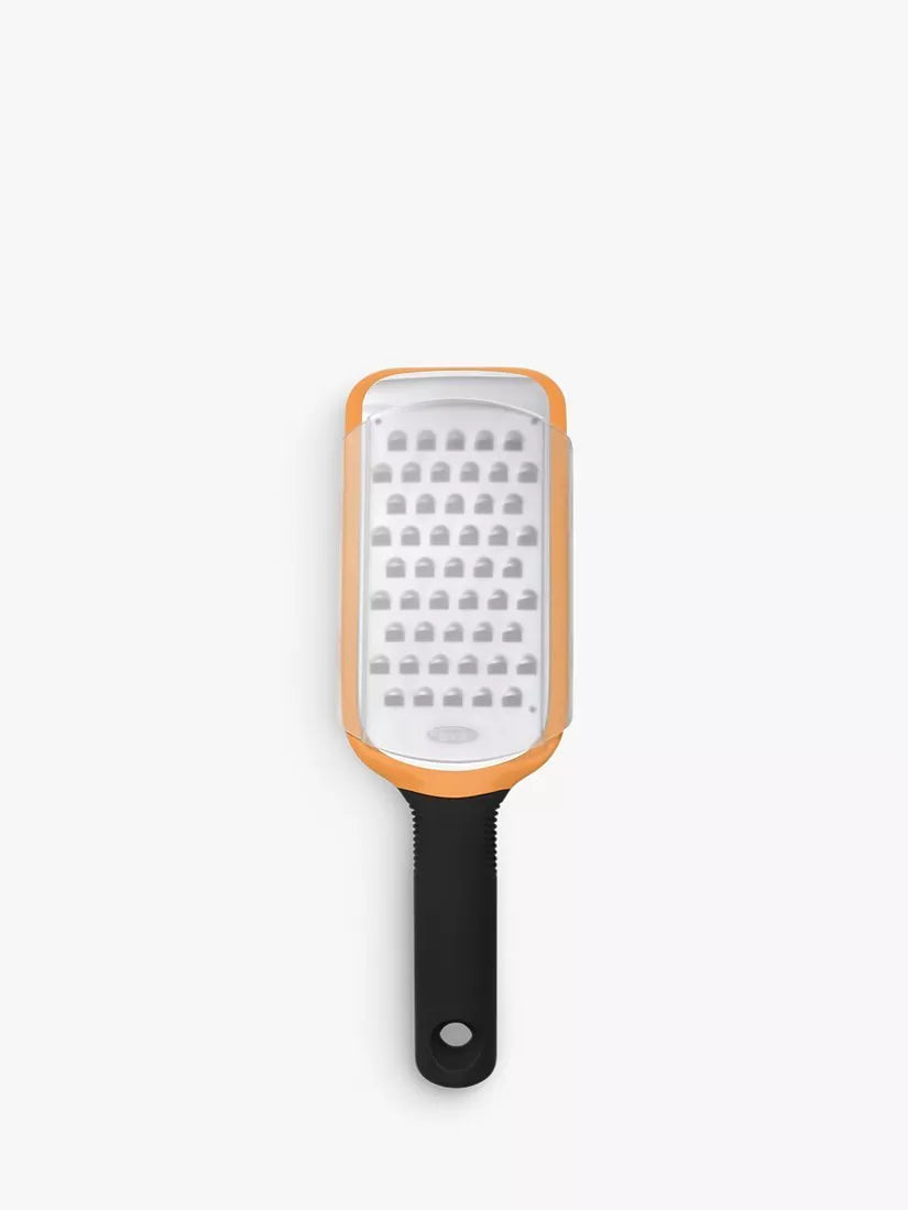 This OXO Good Grips Coarse Etched Grater makes easy work of grating potatoes, semi-soft cheeses, zucchini, onions, butter, and apples. Comfortable soft handle offers a secure, slip-free grip while a non-slip foot provides added control during use.