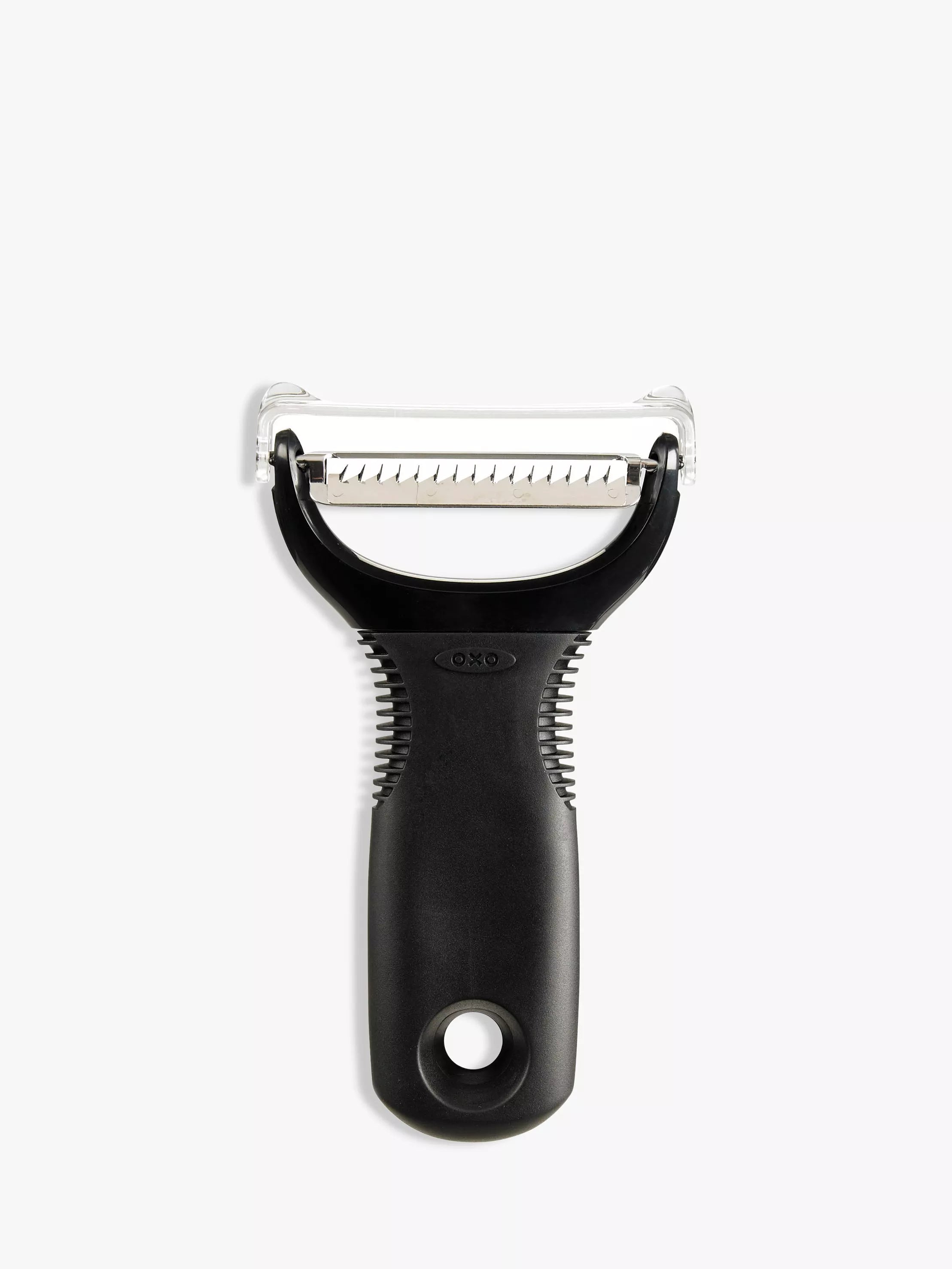 With this OXO Good Grips Julienne Peeler, you can quickly and safely make garnishes, salad toppings, citrus zest and more. The clear safety cover flips out of the way while you peel, but locks back into place as a protective cover during storage.