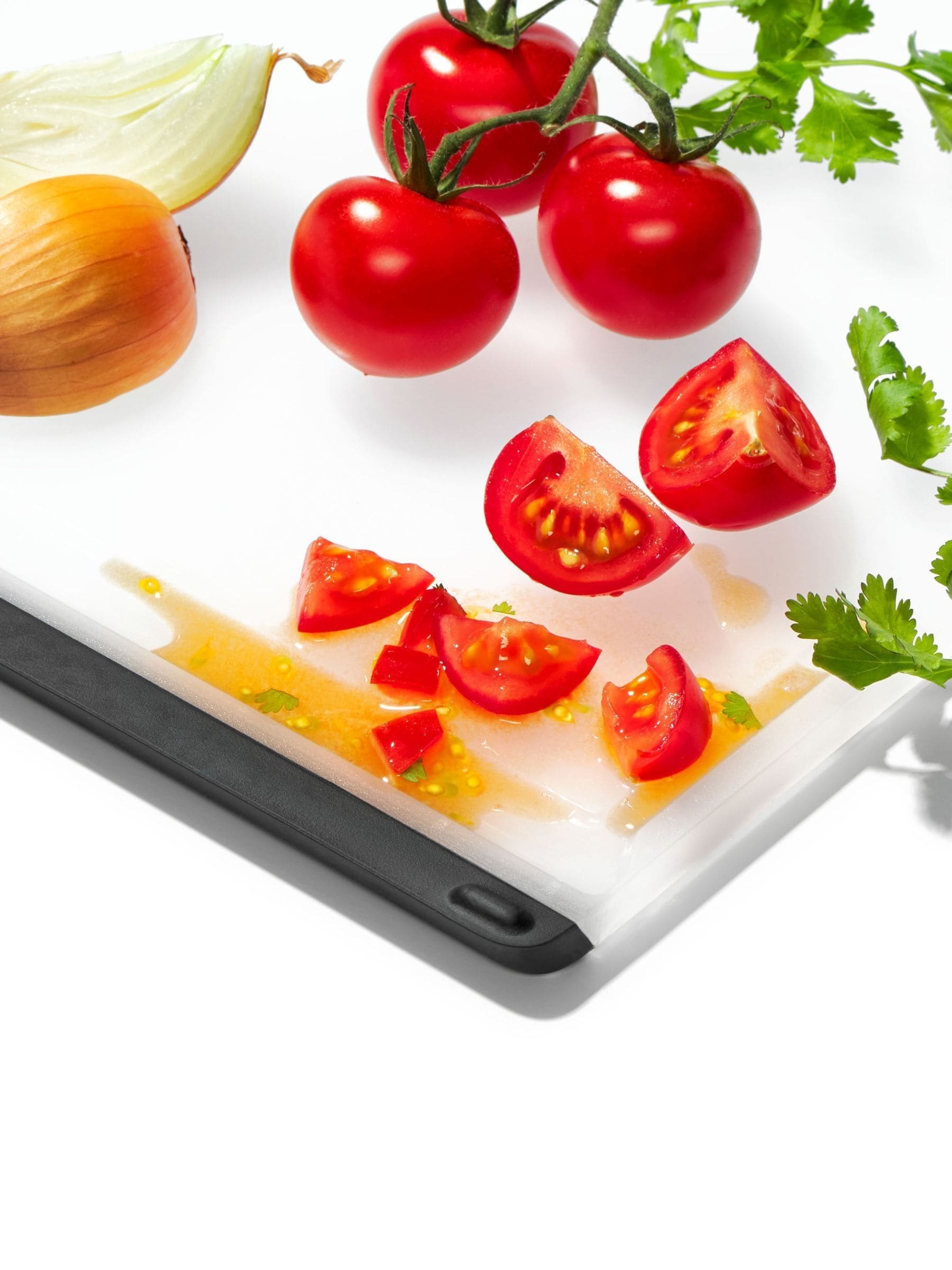 When you're preparing a feast, a tiny cutting board just doesn't cut it. The OXO Good Grips Utility Cutting Board provides plenty of room for chopping, slicing and dicing a small mountain of ingredients for your next meal. Non-porous construction locks out water and odors for a fresh cutting surface, while double-sided design helps you avoid cross-contamination as you work. Use one side for preparing meat and the other for working with veggies to keep flavors from mingling. Soft, tapered edges double as handles for comfortable lifting and carrying, and the cutting surface goes easy on your knives. Non-slip feet keep the cutting board in place for safety as you slice. There's also an integrated drip-catcher to keep even the juiciest foods from making a mess on your counter. When you're done prepping ingredients, pour away excess liquid easily from any corner and pop it in the dishwasher for deep cleaning.