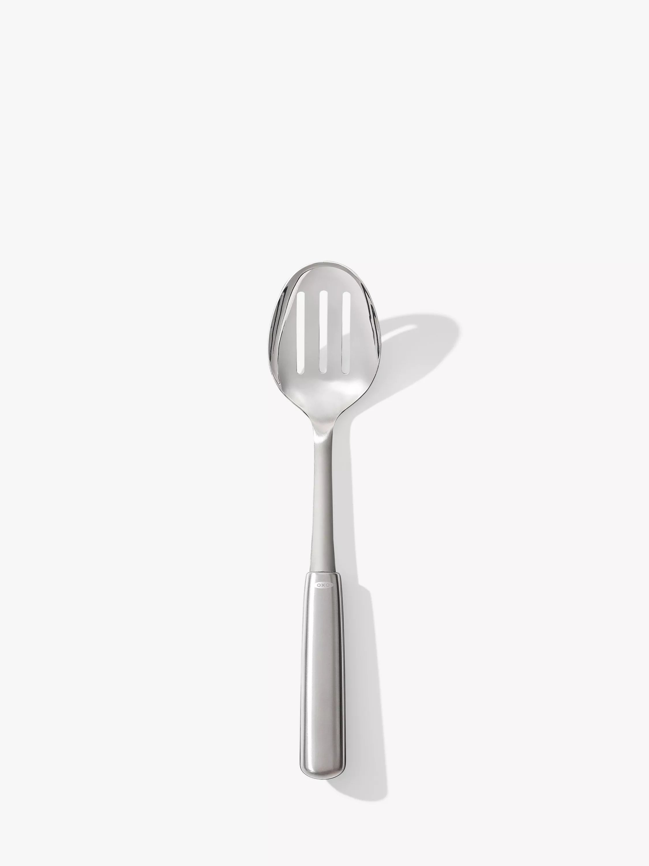 Need to strain vegetables out of a pot? Scoop meatballs from sauce? Stir a homemade soup? The OXO Steel Slotted Spoon is the tool for all these tasks, and more. Its slots have been designed to allow liquid to drain through without making a mess, the whole thing is well balanced, and the stainless steel construction makes the spoon extra sturdy. Plus, the comfortable handle features a non-slip touchpoint for added comfort and the sleek, timeless design means you can use it in the kitchen or at the table.