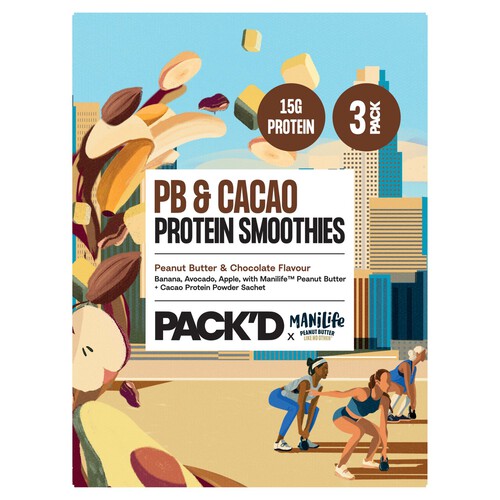 This frozen smoothie kit blends high-quality ingredients including frozen fruit, cacao powder, pea protein, and ManiLife Deep Roast Peanut Butter. It is designed to deliver a distinct, mouthwatering flavour profile alongside a concentrated protein hit. These convenient PACKD protein smoothie kits offer an easy way to prepare a nutritious beverage.