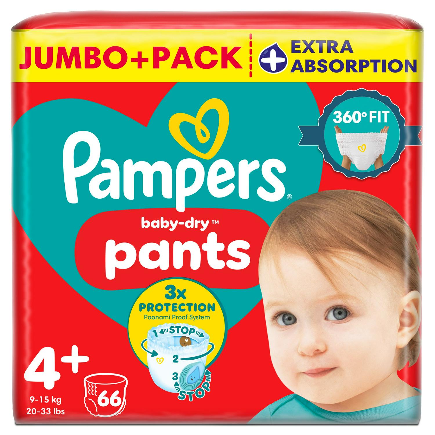 As your baby starts being more active, you want a nappy that can keep up with their new moves. With their revolutionary Stop & Protect System, Pampers Baby-Dry Nappy Pants offer superior all-around leakage protection whatever position your little one gets into - day and night! Pampers Baby-Dry Nappy Pants Stop & Protect System incorporates 2x wider* leg cuffs that help prevent leaks around the legs, a pocket to help stop leaks at the back, a 360° flexible waist design contouring to your little one’s body as they move around, and a super absorbent core offering up to 12 hours of protection. Our plus sizes with boosted core offer you extra reassurance at night or whenever you need even more absorbency. Like all of our nappy pants, Pampers Baby-Dry Nappy Pants are easy to change even when your baby is moving around: just one pull to put on, tear the sides for easy removal, roll up and secure with the tape for easy disposal. Just like you, Pampers put your baby’s safety first: Pampers Baby-Dry Nappy Pants are dermatologically tested and contain 0% EU perfume allergens (as regulated in the EU Cosmetics Regulation No 1223/2009). They are approved by the dermatologists of the Skin Health Alliance and tested and certified according to Standard 100 by OEKO-TEX. Want to know more about the components Pampers uses? Visit pampers.co.uk (*vs before)