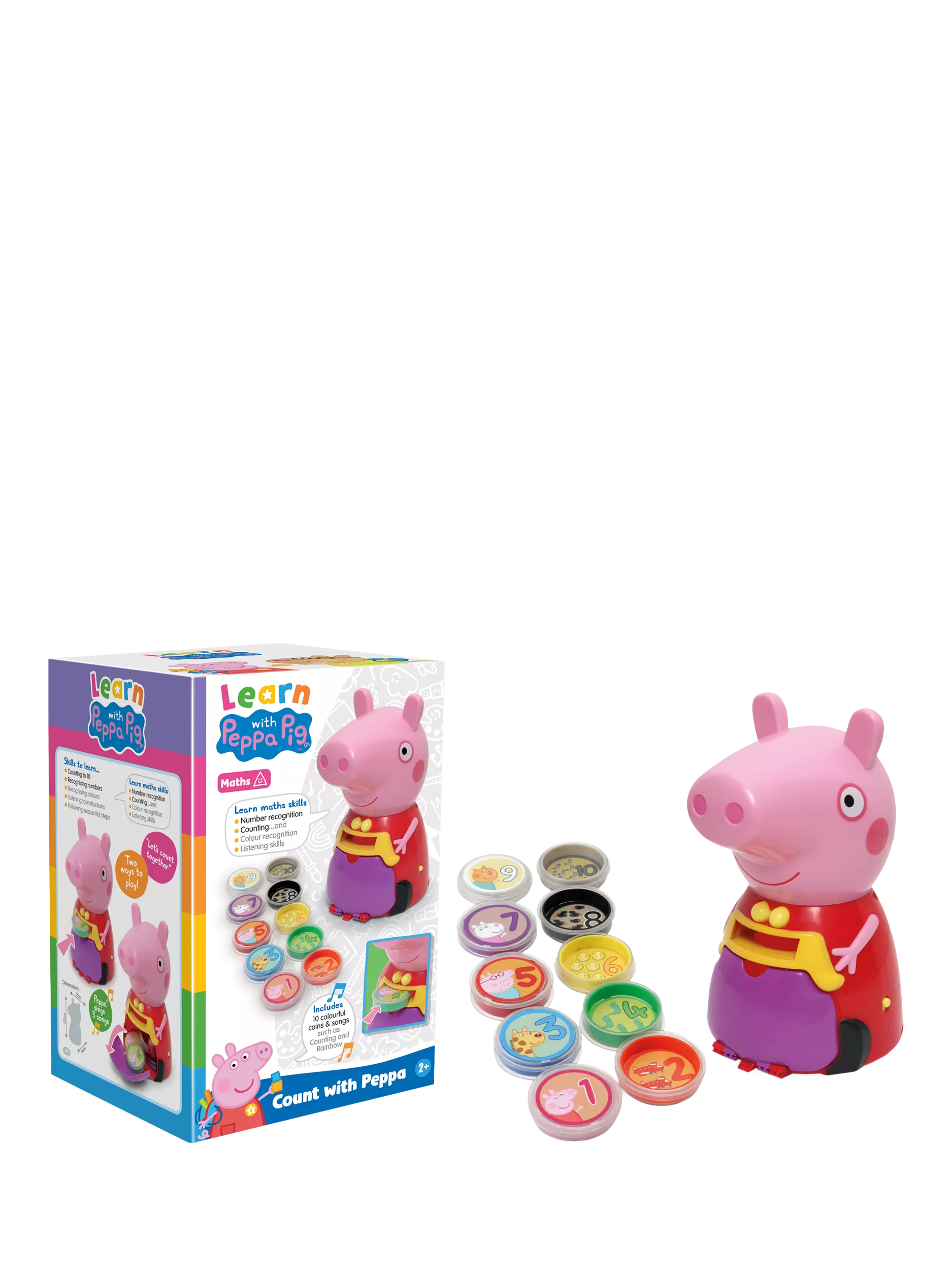 Peppa recognises which coins have been inserted and responds accordingly. With 8 different activities and 10 colourful coins, you can sing along with Peppa as you insert the coins in her purse.