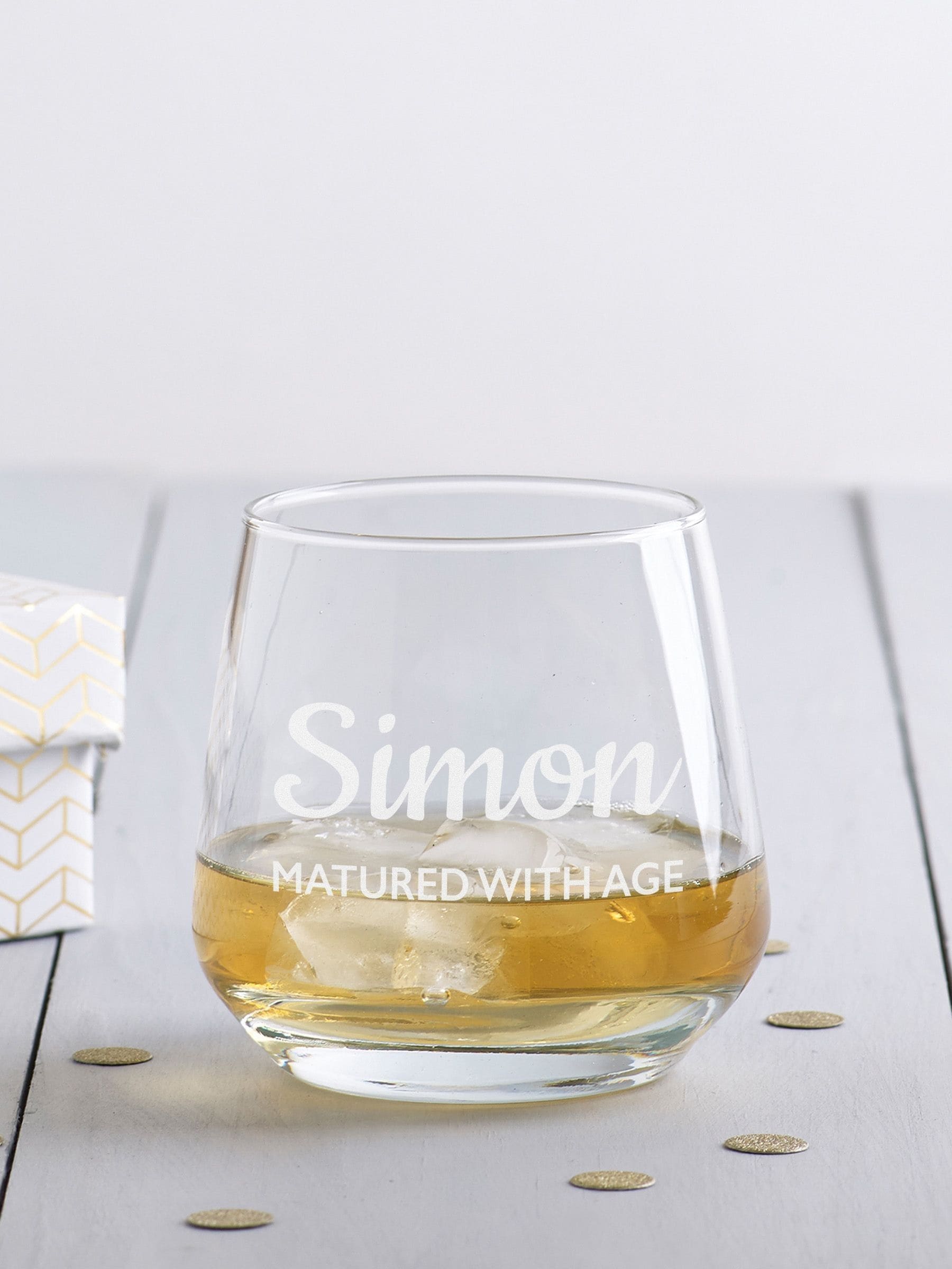 Personalised Single La-Rock Tumbler Glass with your choice of name and message engraved onto the glass. A perfect gift for any special occasion. Personalise with any name 'Matured with Age' is NOT fixed text, please complete both lines of personalisation.