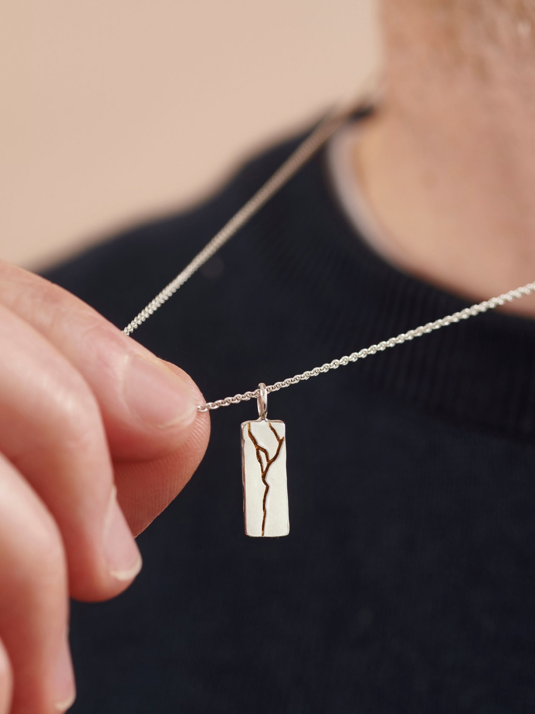 This gorgeous personalised men's necklace is made by our jewellers from sterling silver. Featuring a pendant with an engraved kintsugi-inspired design on one side and personalised on the back using our signature hand stamping personalisation method.This silver necklace is the perfect personalised gift for him, personalised with a special date... Read More
