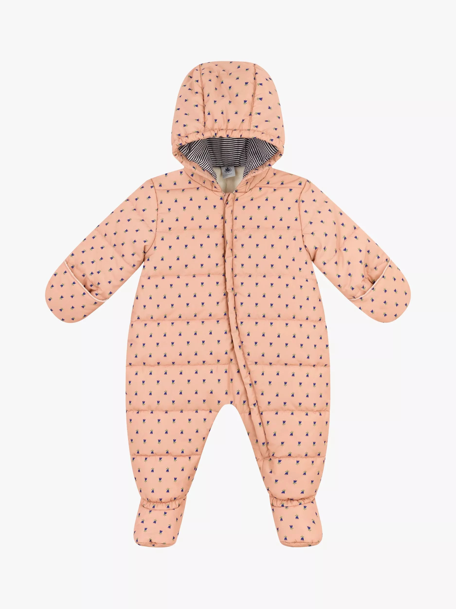 The body of this floral-print snowsuit is fully lined with microfleece, and the sleeves are made of polyamide for easy dressing. The quilted hood is lined with a pinstriped jersey fabric.